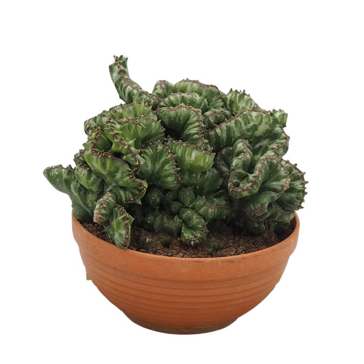 Euphorbia cristata in a bowl is an extraordinary and eye-catching plant that brings a sculptural, almost coral-like quality to any indoor display. Known for its fascinating crested growth, this variety forms intricate, fan-shaped ridges that can appear in shades of green, blue-grey, or even with tinges of pink or purple, depending on light conditions. Its unusual form and textured surface make it a striking choice for customers looking for something out of the ordinary, whether as a centrepiece or part of a curated succulent collection. This plant prefers a bright position with plenty of indirect light and can tolerate some direct sun, which may enhance its colour. Like most Euphorbia, it is highly drought-tolerant and should be watered sparingly, only when the soil is completely dry. A free-draining cactus or succulent mix is essential to prevent root rot, and watering should be reduced even further during the winter months. Feeding is rarely needed, but a light application of a balanced fertiliser during the growing season can support overall health. While it may look exotic, Euphorbia cristata is surprisingly easy to care for and well-suited to indoor environments. The bowl format not only complements its unusual shape but also provides a stable base for its often top-heavy growth. As with all Euphorbia, care should be taken when handling, as the milky sap can be a skin irritant. Its dramatic appearance and minimal maintenance needs make it a highly desirable addition to garden centres and houseplant shops aiming to offer unique and conversation-starting specimens.