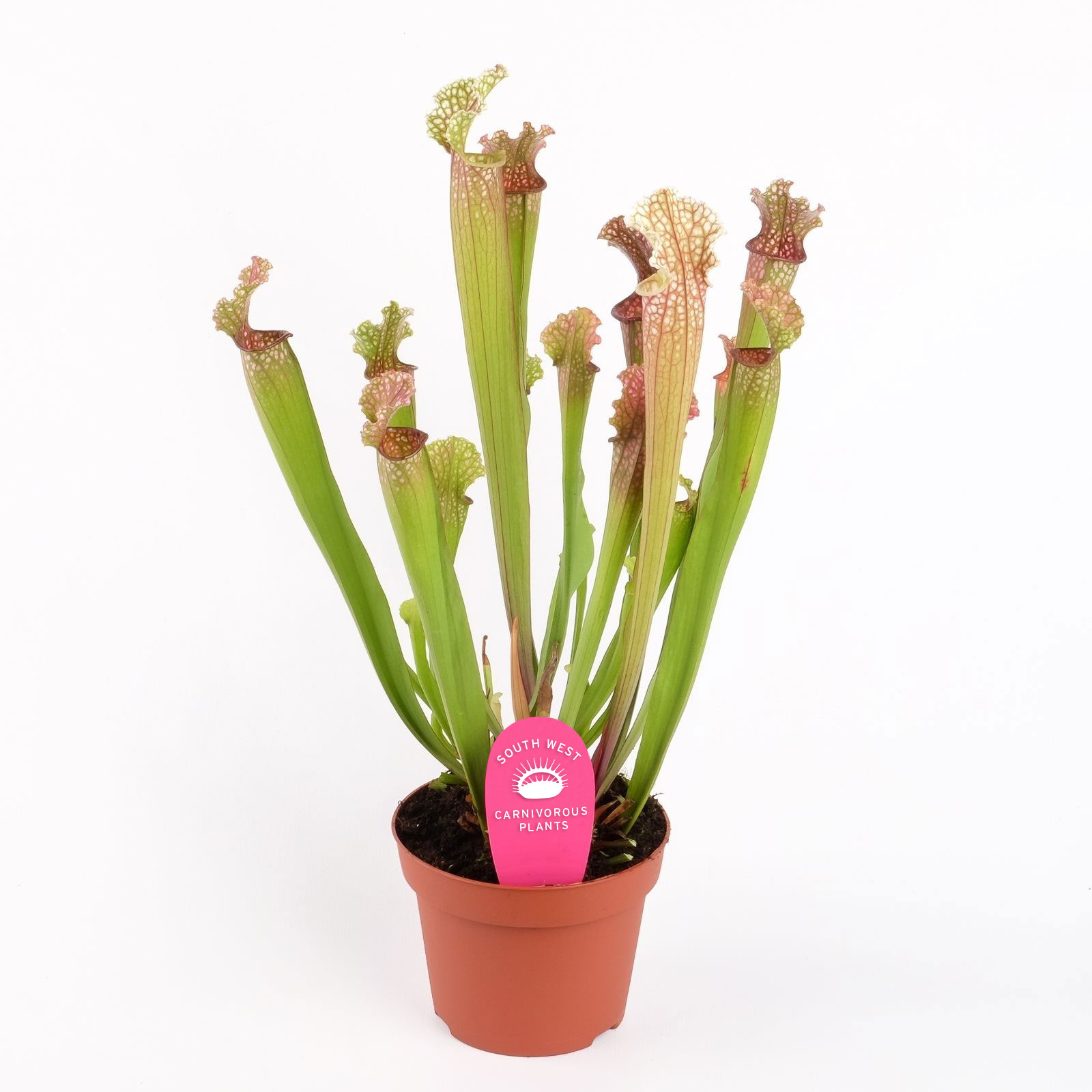 Sarracenia x stevensii is a highly sought-after hybrid, renowned for the captivating red coloration of its cups, which draws the attention of many enthusiasts. This trumpet pitcher plant is distinguished by its slightly narrower and shorter pitchers compared to other varieties in its genus.